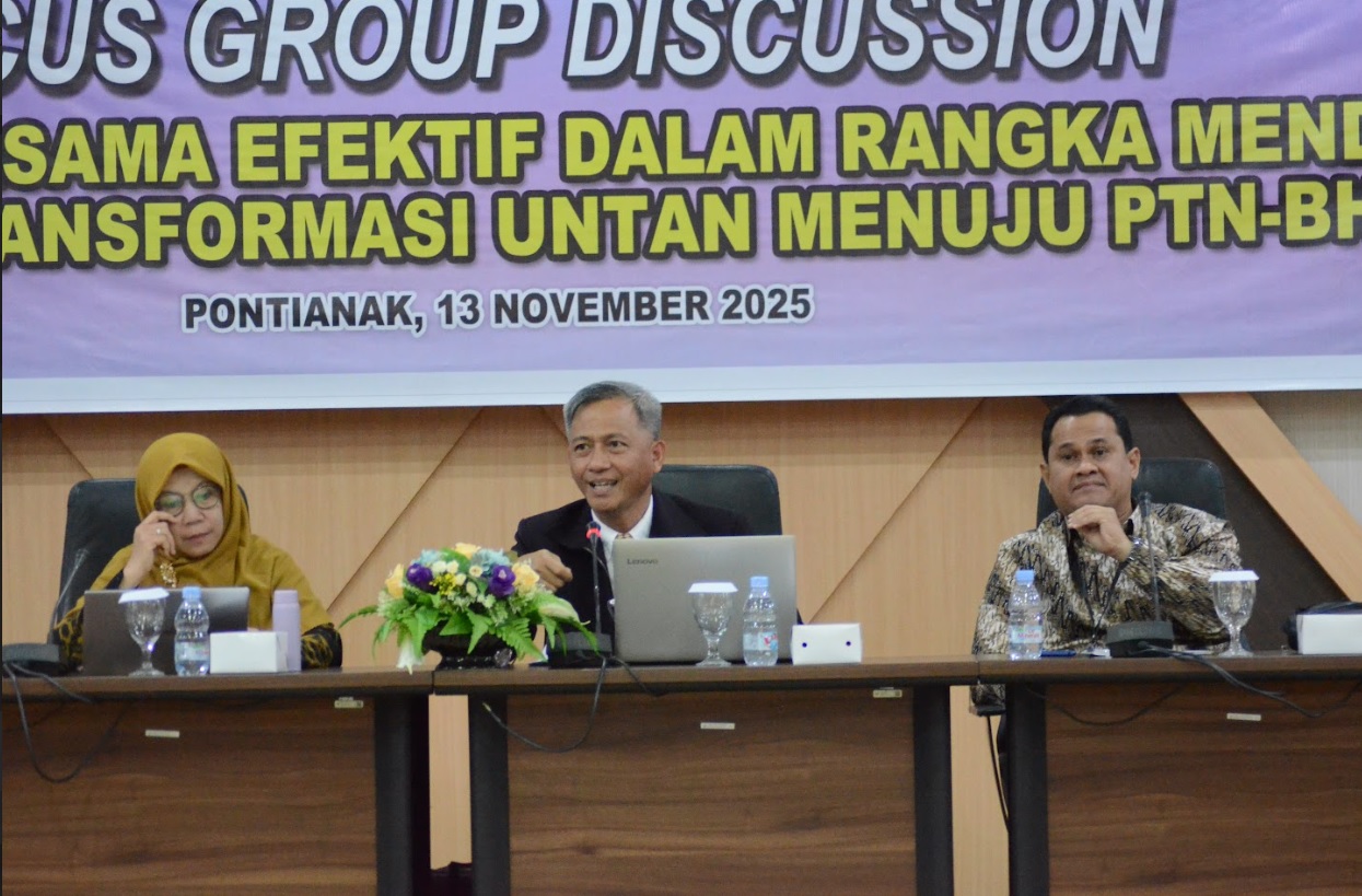 Universitas Tanjungpura (UNTAN) menggelar Focus Group Discussion (FGD) bertema “Strategi Kerja Sama Efektif dalam Rangka Mendukung Proses Transformasi UNTAN Menuju PTN-BH”, yang dihadiri para pimpinan Fakultas, Unit dan Lembaga di Lingkungan Universitas Tanjungpura, pada Kamis (13/11/2025).