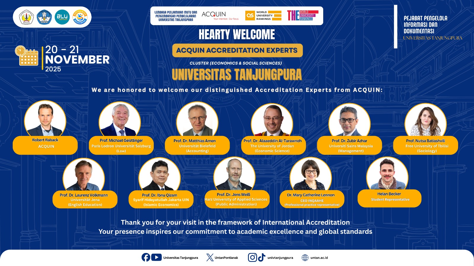 Pontianak, 20 November 2025 — Universitas Tanjungpura (UNTAN) resmi memulai proses penilaian akreditasi internasional oleh Accreditation, Certification and Quality Assurance Institute (ACQUIN) Jerman pada 20–21 November 2025. Pembukaan kegiatan berlangsung di Gedung Rektorat Lantai 2 dan dipimpin langsung oleh Rektor Universitas Tanjungpura.